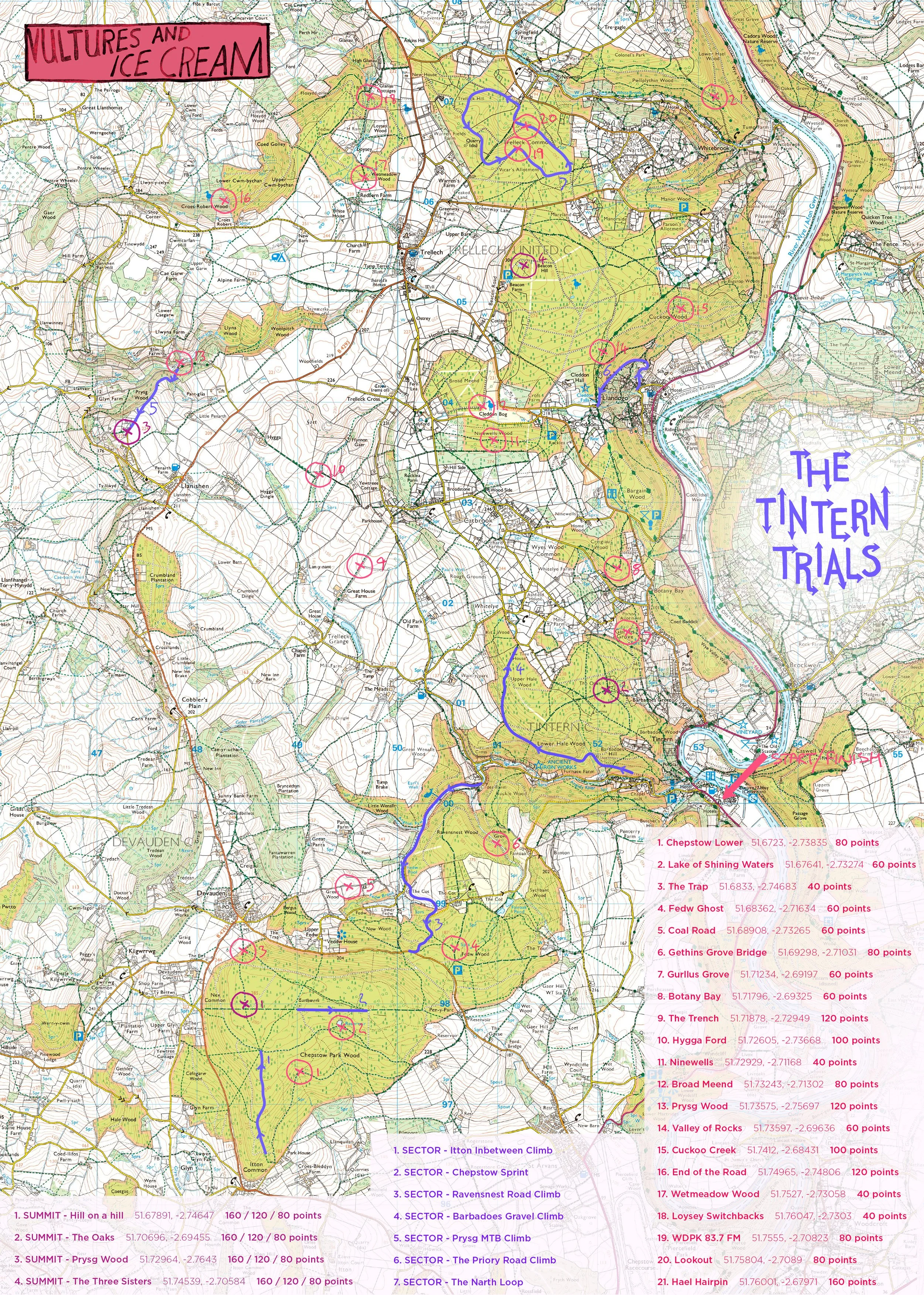 We ran the first edition of The Tintern Trials in May 2021. The riders escaped with their lives and seemed keen for a second edition. I contemplated October but the Summer flashed by and to be honest, with some new course editions and challenges, September 2022 2024 seems more fitting. We are opening up participation a little and I am hoping to get about 30 riders on the start line. I have added more locations and tweaked the format a little - you can read more about the event below, if you would like to enter please drop us an email to vulturesandicecream@gmail.com and I will add you to the mailing list.
